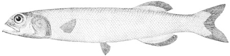• Description: Small, slim fish with a streamlined body. The prominent first dorsal fin is high and distinctively shaped with second dorsal fin very small with no rays supporting it. Two anal fins present both set far back on the underside of the body. The tail is deeply forked. Eyes are very large. Colour silvery, sometimes with a yellow/green tinge.
